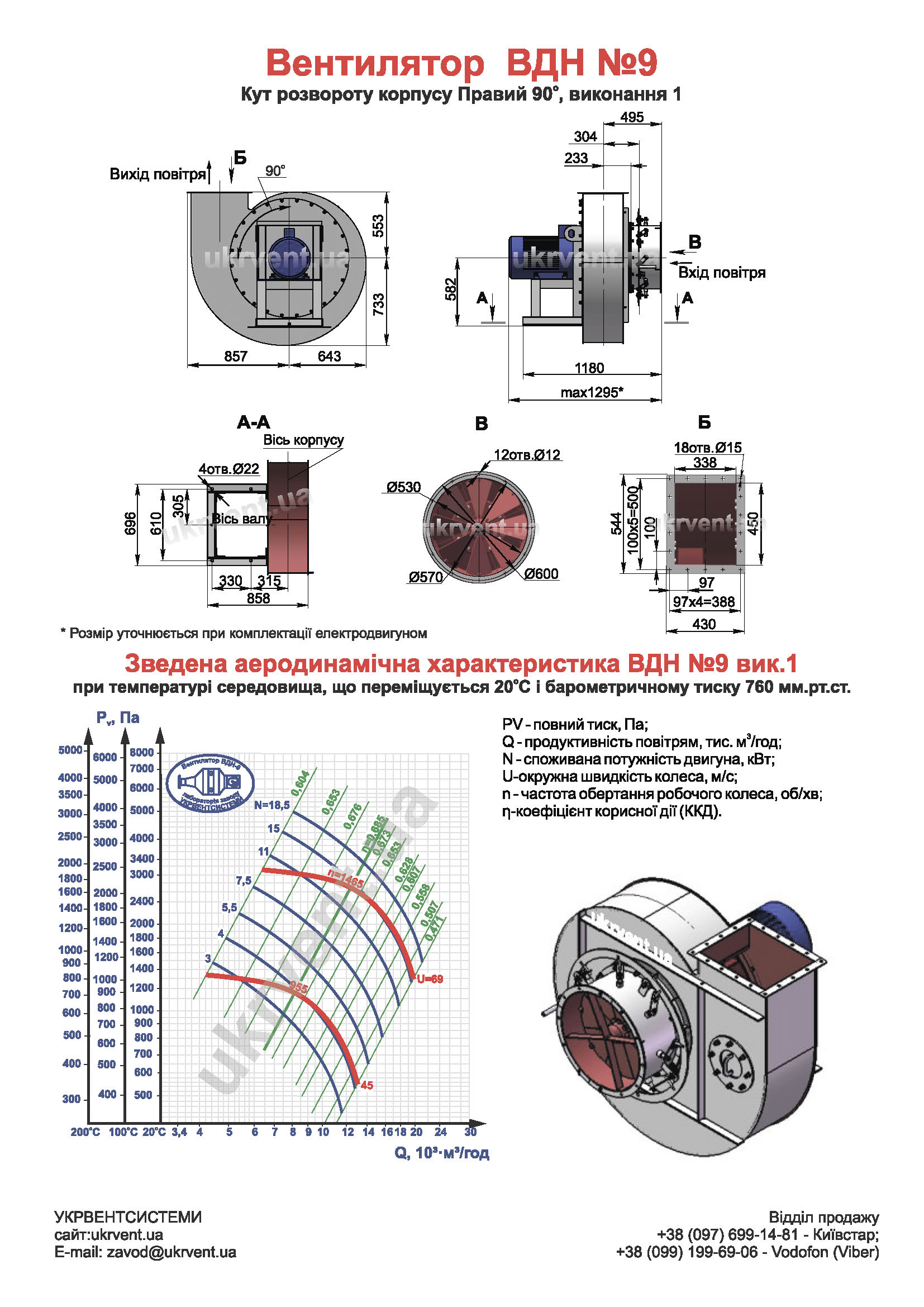Цей вентилятор ВДН-9 (ВДН №9, ВДН 9, димосос ВДН-9) оснащений двигуном потужністю 15 кВт, який працює на частоті 1500 оборотів на хвилину, і є ефективним рішенням для різних промислових застосувань. Корпус вентилятора встановлений під кутом 90 °. Вентилятор виконаний за першим конструктивним виконанням, де робоче колесо безпосередньо встановлено на валу електродвигуна.