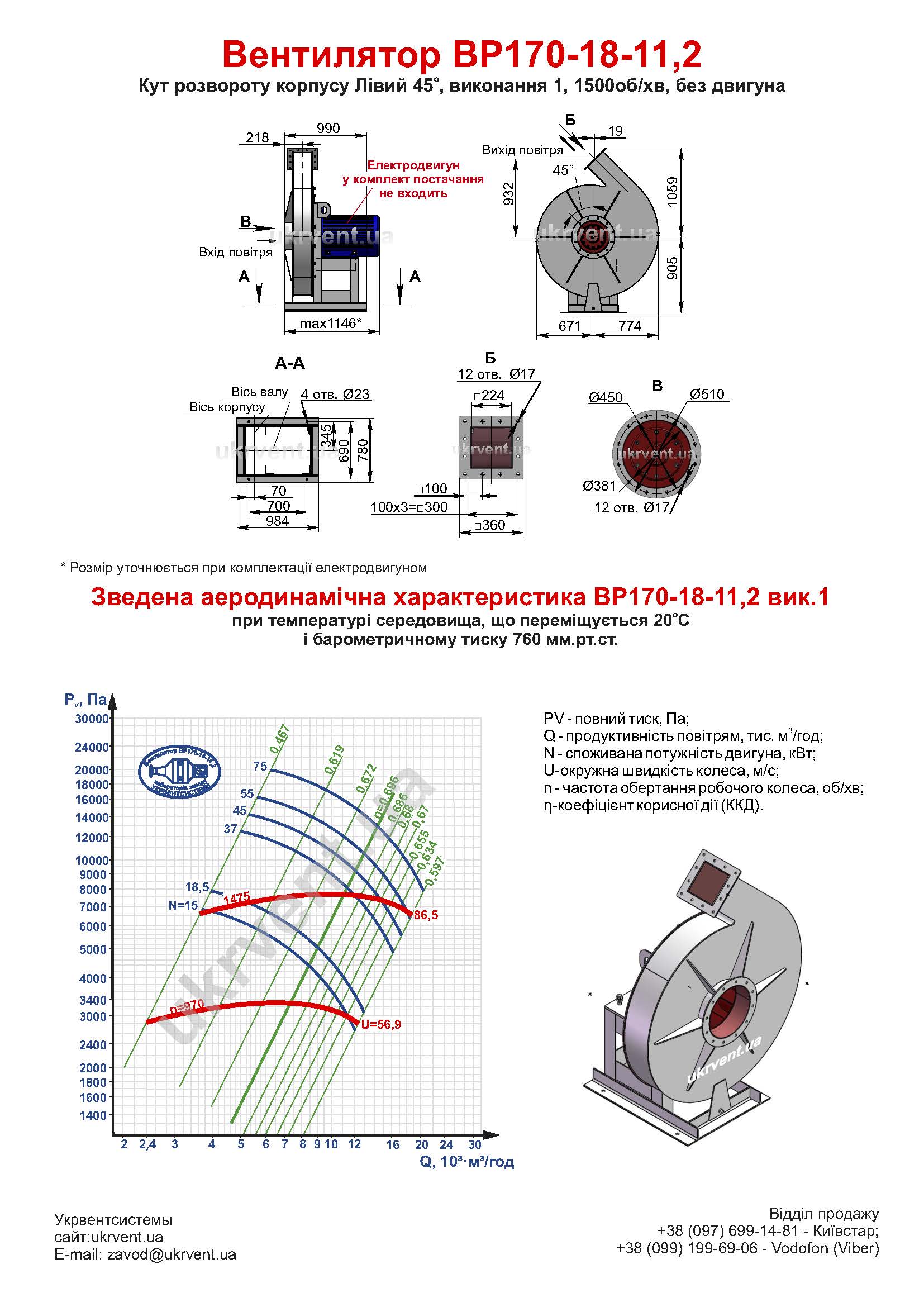 Умови експлуатації відцентрового вентилятора високого тиску ВР170-18 №11,2 1 виконання з двигуном 37кВт 1500об/хв