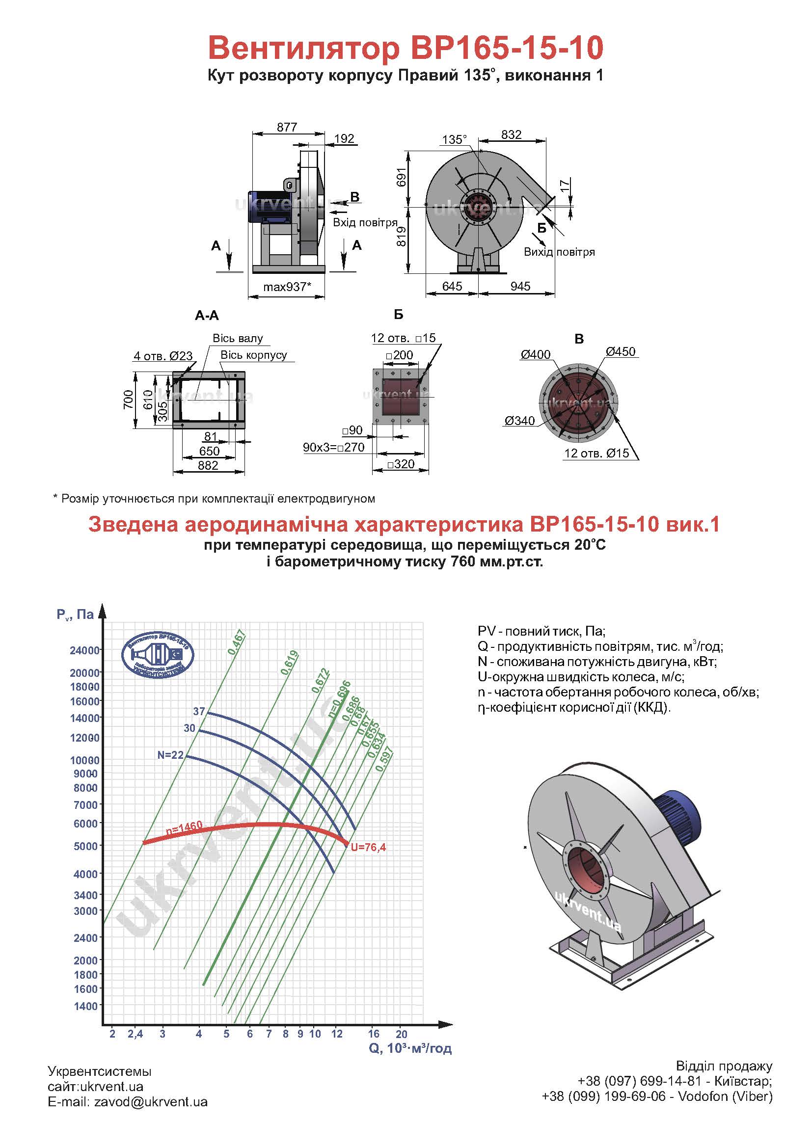 Умови експлуатації відцентрового вентилятора високого тиску ВР165-15 №10 1 виконання з двигуном 22кВт 1500об/хв