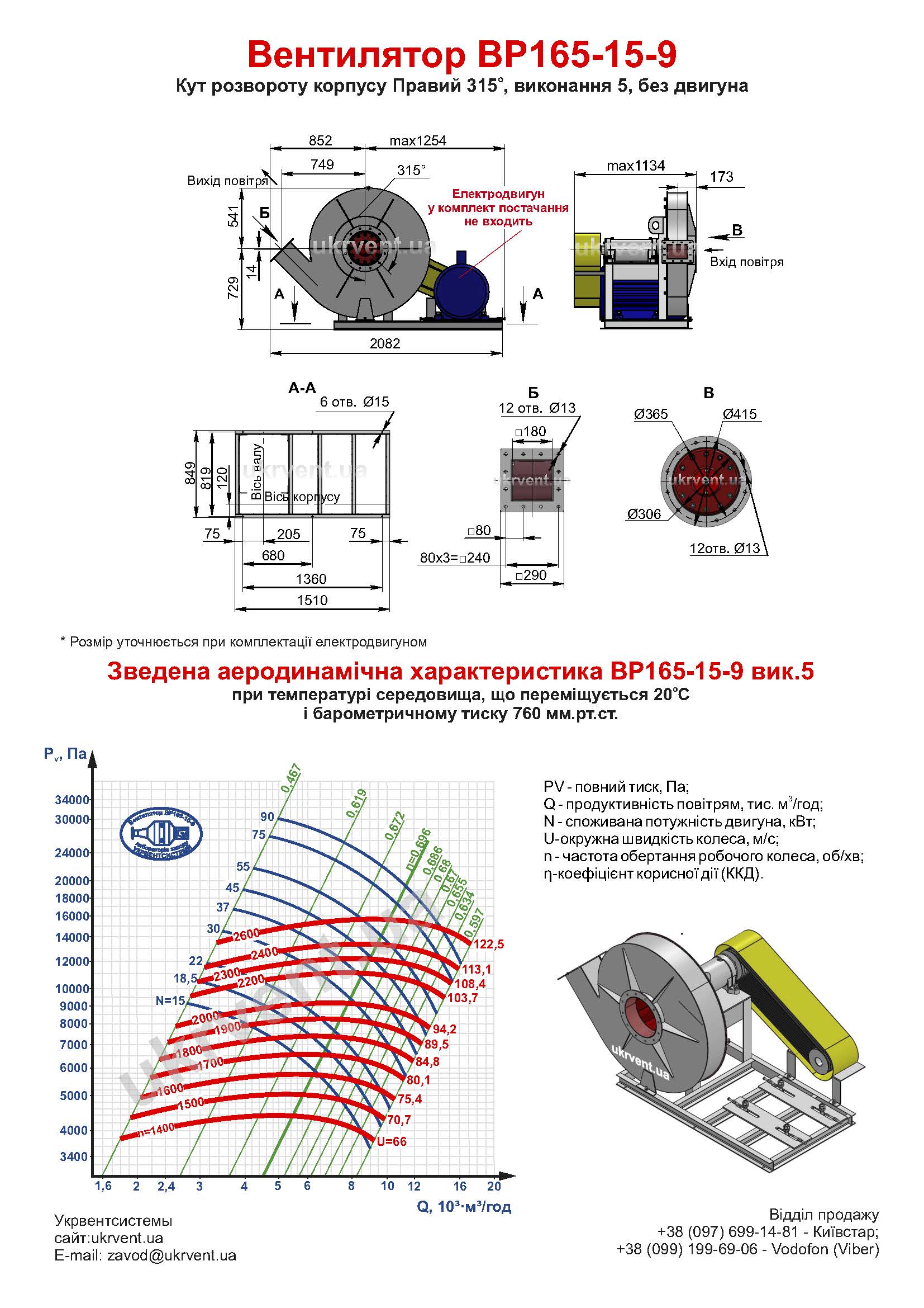 Умови експлуатації відцентрового вентилятора високого тиску ВР165-15 №9 5 виконання з двигуном 18,5кВт 1500об/хв